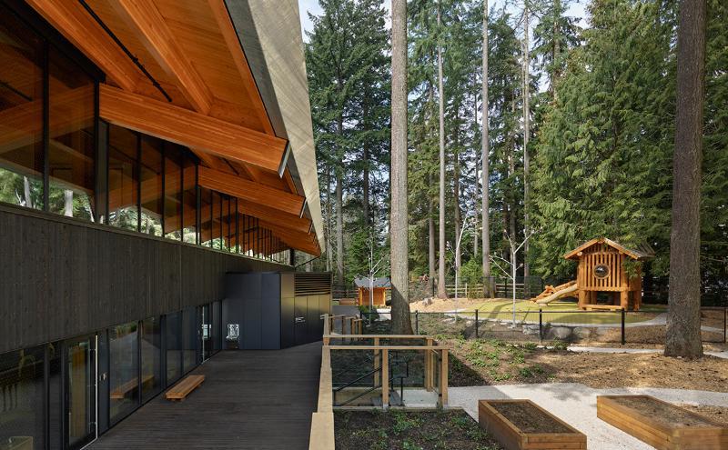 There are separate outdoor play areas for the two age groups. The wooden play structures were built from trees removed during the facility's construction and around the existing trees in the area to continue the connection to nature.