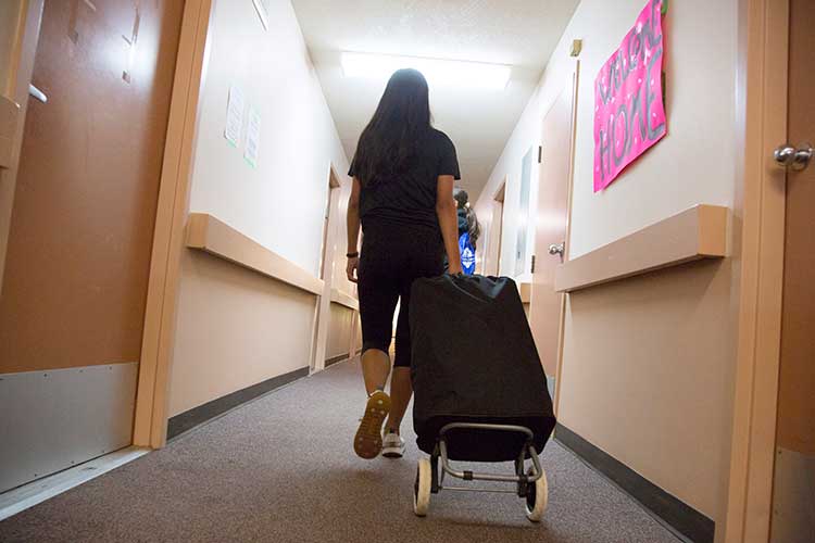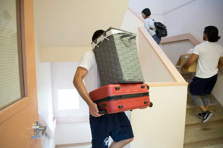 Capilano University Blues student athletes help families with luggage during move in day at the CapU Residence on Friday, Aug. 31, 2018.