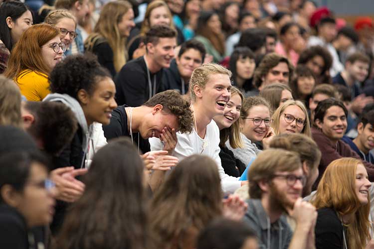 Students laugh during a presentation by Dr. Chris Bottrill at the Centre for International Experience's International Student Orientation on Thursday, Aug. 31, 2018.