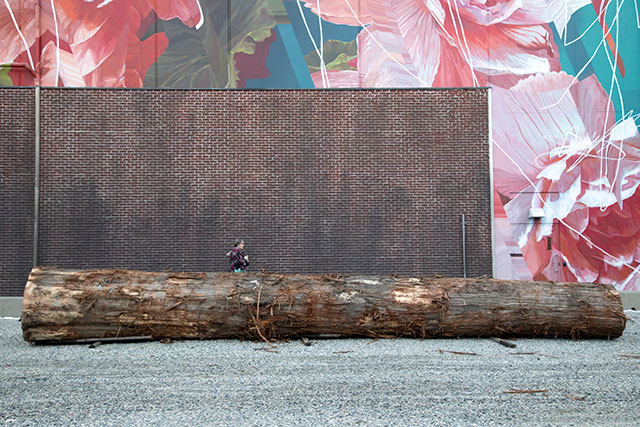A Western Red Cedar, sourced from near Ring Mountain in Squamish, BC, is delivered to the North Vancouver campus on February 4. Master carver Ses siyam (Ray Natraoro) is carving a 30-foot seaworthy canoe as a legacy to the University's 50th anniversary.