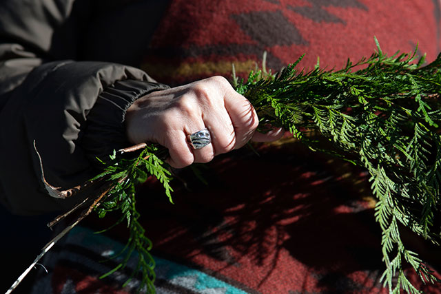 Noelle Natraoro holds a cedar brush during the canoe legacy project log blessing ceremony on February 25.