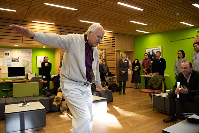 Elder-in-residence Ernie George dances during his birthday celebration in the Kéxwusm-áyakn Student Centre on February 5.