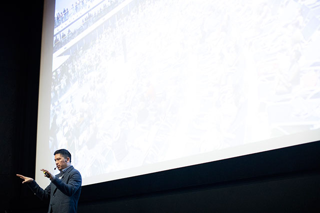 Entrepreneur and philanthropist Bruce Poon Tip speaks at the North Vancouver campus on February 6.