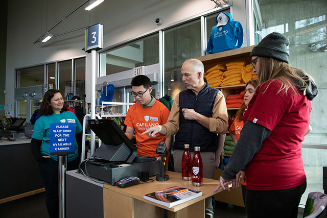 Education and Employment Access (EEA) students receive hands on experience in cashier training at the Capilano University bookstore on February 7. The EEA program helps students, who have experienced barriers to accessing education and employment, learn skills to succeed in future education and vocational goals. The cashier training was a collaboration between EEA and the Capilano University Bookstore to address a need for real-life experience prior to the students going out on their practicums.