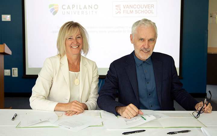 Laureen Styles, VP Academic & Provost of Capilano University, and James Griffin, President of Vancouver Film School (VFS), sign a block transfer agreement on Monday, Aug. 19, 2019. CapU and VFS announced their partnership to establish accelerated educational pathways between the two institutions.
