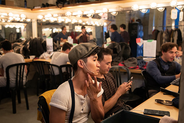Caleb Lagayan, alumnus of Capilano University's musical theatre program, puts on make up for Disney's Newsies at Theatre Under The Stars in Stanley Park on Aug. 5, 2019.