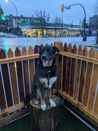 Seymour, owned by Capilano University staff member Aurelea Mahood, enjoys a stop at the Barklet.