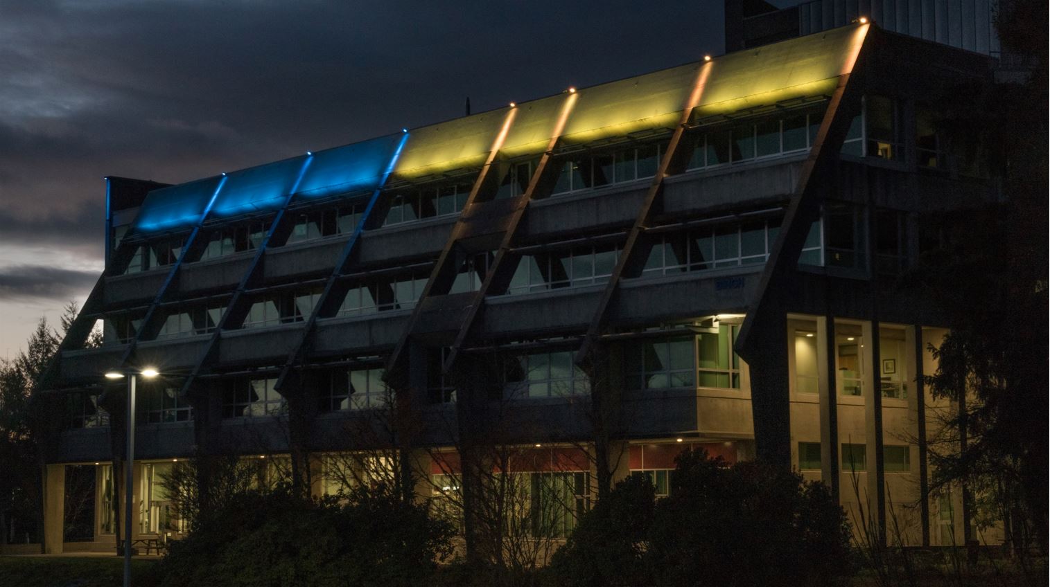 Joining other landmarks around the world, the exterior of Capilano University’s Birch Building is now lit up in support of Ukraine. The lighting sequence will illuminate the colours of the Ukrainian flag, transition to white to represent peace, then fade into the colours of CapU as we come together in support of the people of Ukraine who continue to light the way with their courage and determination.