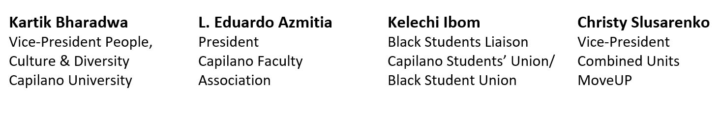 Together, CapU, the CSU, CFA and MoveUP, agree to the charter’s four principles, as outlined in the Scarborough Charter on Anti-Black Racism and Black Inclusion in Canadian Higher Education: Principles, Actions, and Accountabilities, and remain accountable to the University’s EDI initiatives and human rights commitments that support: