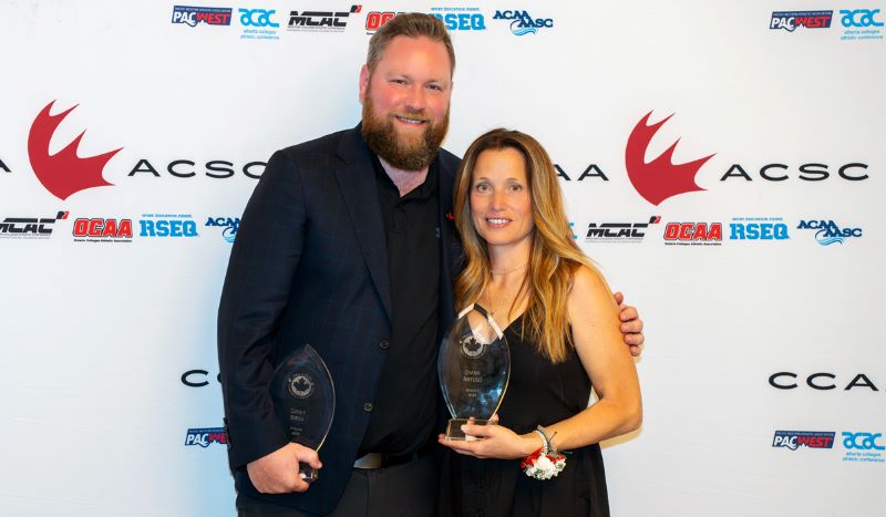 Diana Artuso and Corey Birza, each the Blues all-time scoring leaders for their respective programs, accepted their Hall of Fame honours June 17 along with inductees from other PACWEST/BCCAA schools.