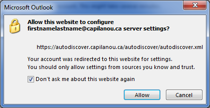 - Outlook may prompt you to accept the email settings. Select Don't ask me about this website again and click Allow to continue.