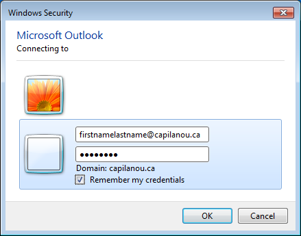 - On the Windows Security screen, enter your Capilano University email in the first field and your Capilano University password in the second field.