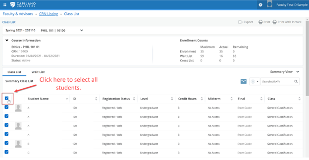 - If you want to email the whole class, select all students by clicking the check box at the top of the class list. If you want to email a single student or a select group of students, leave the check box at the top of the list unchecked. Then, click the check box next to the student(s) you want to email.
