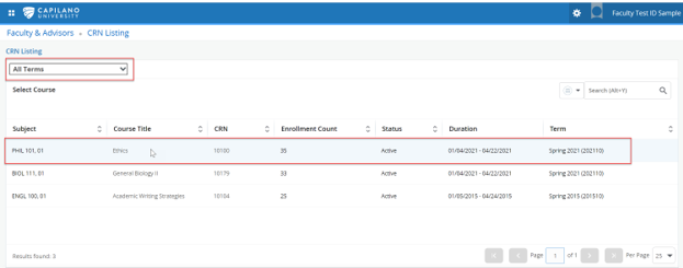 - From the Class Lists and Wait Lists page, click on a course to open the associated class list. If required, use the drop down menu on the top left to search for and select a term to filter your list of courses.