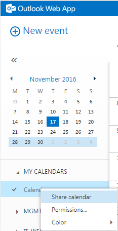- Right-click on your calendar and then click Share calendar from the pop-up menu.