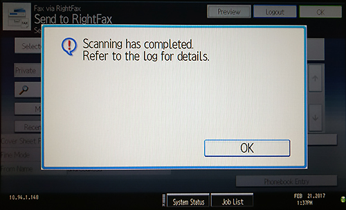 - Once your documents have been faxed, the screen will show a message "Scanning has completed.". A few minutes later, you will receive an email confirmation.