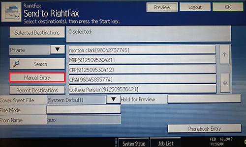 - You should see the "Send to RightFax" screen. Click Manual Entry and enter 9 followed by the fax number (e.g. 96049844952).