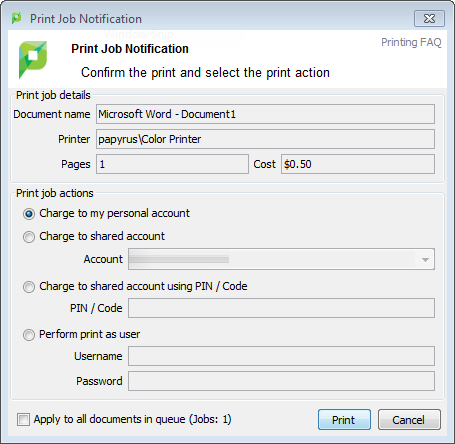 - Select Charge to shared account and choose your departmental PaperCut account for work-related printing.