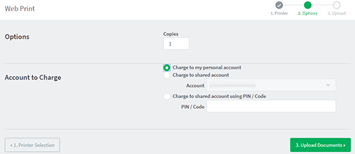 - Choose how many copies you would like to print, select Charge to my personal account and click Upload Documents.