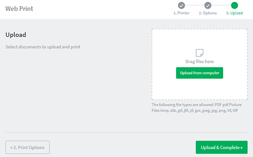 - Click Upload from computer, select your document(s) and click Open. Click Upload & Complete to print.