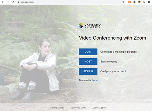 - Navigate to capu.ca/zoom where you will select "Sign in" and then login with your Capilano University username and password. Note: In most cases, CapU single-sign-on (SSO) will have logged you in automatically.