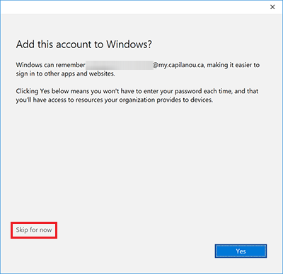 - Click Skip for now on the "Add this account to Windows?" screen.
