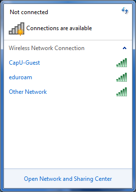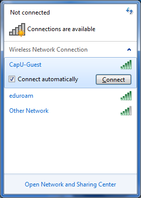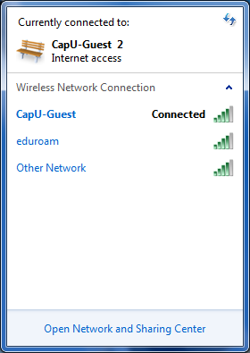 - Click on the Wi-Fi icon on the bottom-right corner of the screen and select CapU-Guest.