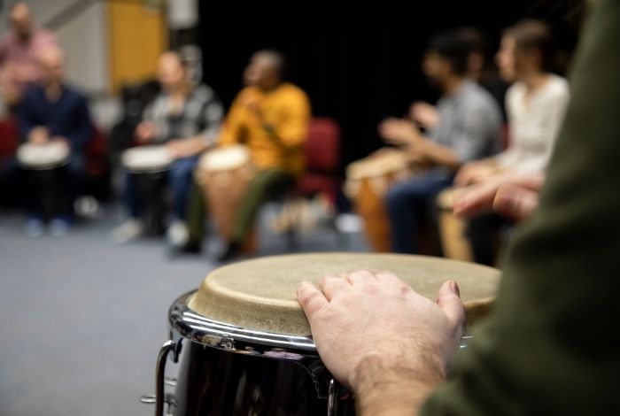 Directed by David Robbins, Kenté (the Ghanaian word for woven cloth) is an upbeat ensemble that interweaves the rhythm and melodies of many musical genres from around the globe. Narwhal is a large ensemble combining instrumental and vocal musicians. Directed by Jared Burrows, the ensemble often features student compositions and arrangements and is known for exploring the outer reaches of jazz and its intersections with music from other genres. Percussion Ensemble, directed by Robbins and Kofi Gbolonyo, is comprised of all current drummers/percussionists in the Jazz Studies program. The ensemble explores rhythmic sounds and timbres from many eras and around the world.